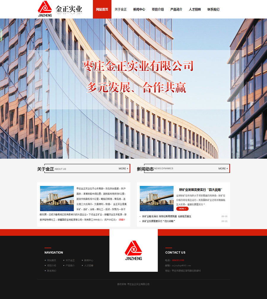 祝賀金正實(shí)業(yè)有限公司網(wǎng)站上線 訪問地址:http://www.jinzhengshiye.com/ 公司介紹: 棗莊金正實(shí)業(yè)位于山東南部。處在京臺高速、京滬高鐵、津浦鐵路中間位置,距鐵路專用貨場5公里,距徐州觀音機(jī)場70公里,毗臨日照港、青島港、連云港三大出?冢煌ū憷、快捷。 金正實(shí)業(yè)是集采礦、選礦、冶煉、煤化工、投資、貿(mào)易為一體不斷發(fā)展,已成為魯南地區(qū)較有影響力的大型企業(yè)。下設(shè)金正礦業(yè)、新疆雙全五洋能源、并參股伊犁特煤化工、新疆國投寶地能源等公司,F(xiàn)有職工3000余人,資產(chǎn)20億元。先后獲得棗莊百強(qiáng)企業(yè)、突出貢獻(xiàn)企業(yè)、誠信經(jīng)營企業(yè)、納稅十強(qiáng)企業(yè)、山東省工會工作先進(jìn)企業(yè)等榮譽(yù)稱號。 金正礦業(yè)年產(chǎn)鐵精粉60萬噸,金正實(shí)業(yè)年產(chǎn)鑄造用生鐵26萬噸,主要銷往江蘇、浙江、福建、安徽、河北、山東等地,深受廣大客戶好評。 公司始終秉承“多元發(fā)展、合作共贏”的經(jīng)營理念,遵循“精誠團(tuán)結(jié)、銳意進(jìn)取”的企業(yè)精神。竭誠為客戶提供優(yōu)質(zhì)的產(chǎn)品和服務(wù)。真誠歡迎各界同仁前來指導(dǎo)、合作,我們愿與您風(fēng)雨同舟、攜手共創(chuàng)美好未來。