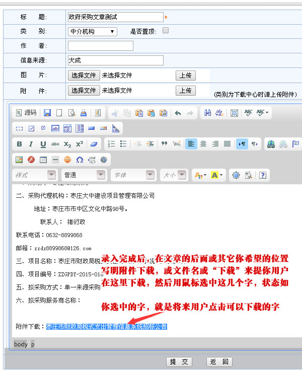 根據上圖完成編輯后,直接可以把各種文檔以附件方式上傳,以方便用戶下載瀏覽。就能完成文章的發(fā)布。下面說下附件的上傳辦法。